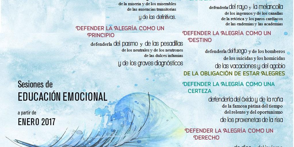 Nov192016Educación EmocionalPróximas Actividades Categories: Educación Emocional, Próximas ActividadesBy Sandra Camas19 de noviembre de 2016Leave a commentTags: educación emocionalpoemapromocióntalleres Author: Sandra Camas Post navigationPreviousPrevious post:Taller «La Danza del Corazón»NextNext post:FELIZ NAVIDAD al estilo Centro de Relaciones InterpersonalesRelated PostsCINCO LENGUAJES PARA LA AFECTIVIDAD6 de junio de 2017Símbolos de nuestros pensamientos31 de mayo de 2017Identificación de pensamientos en clave de humor.13 de mayo de 2017Emo-cognición: Cómo nos hablamos de nuestras emociones.29 de abril de 2017«Necesitamos Emocionólogos».16 de febrero de 2017¡JUEGO! E-MOVERE. La emoción es movimiento.12 de febrero de 2017